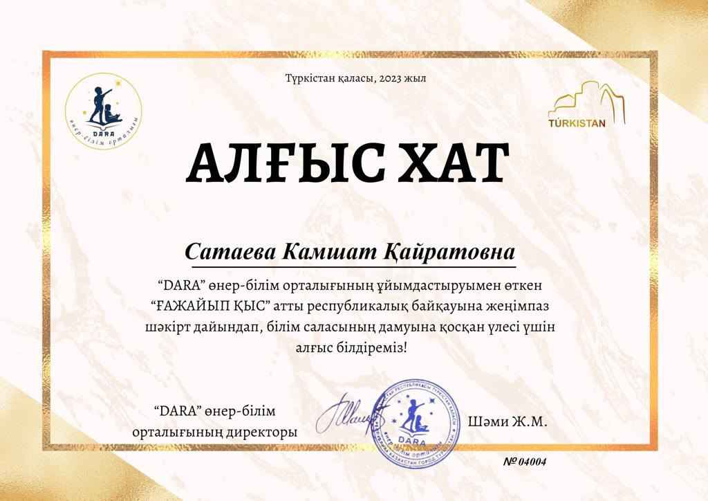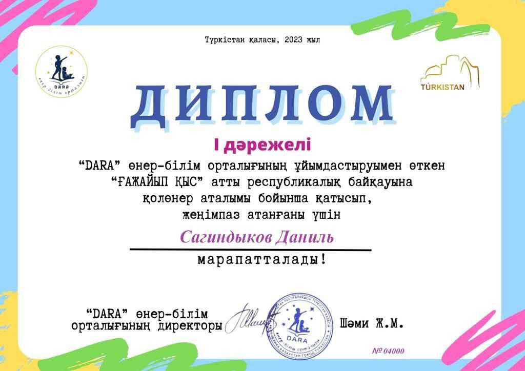 TURKISTAN І дәрежелі "DARA" өнер-білім орталығының ұйымдастыруымен өткен "ҒАЖАЙЫП ҚЫС" атты республикалық байқауына қолөнер аталымы бойынша қатысып, жеңімпаз атанғаны үшін Сагиндыков Даниль
