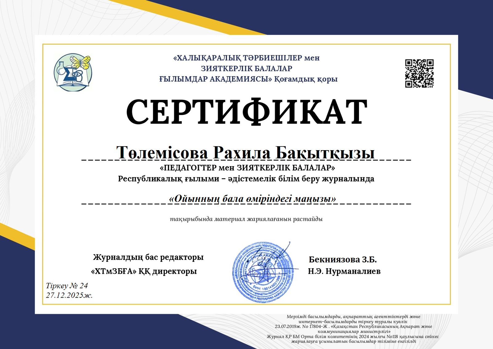 Педагогтер мен зияткерлік балалар 2025 №24-777 журнал